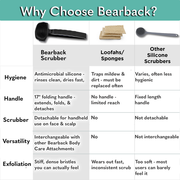 And like all Bearback tools, it's fully interchangeable. Slide off the scrubber head and snap on any other Bearback back & body care attachment in seconds.